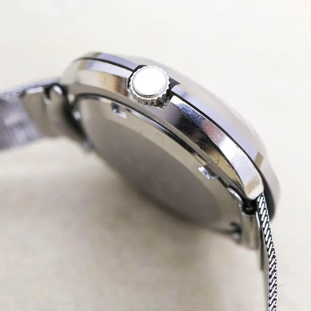 1971年製 で希少な超硬ケースを採用しています。超硬ケースはセイコーではNSAと呼ばれていて傷や腐食に強いケースで独特の質感が魅力的です。3面のカットガラスや楕円形型のケースも70年代の良い雰囲気を出しています。
